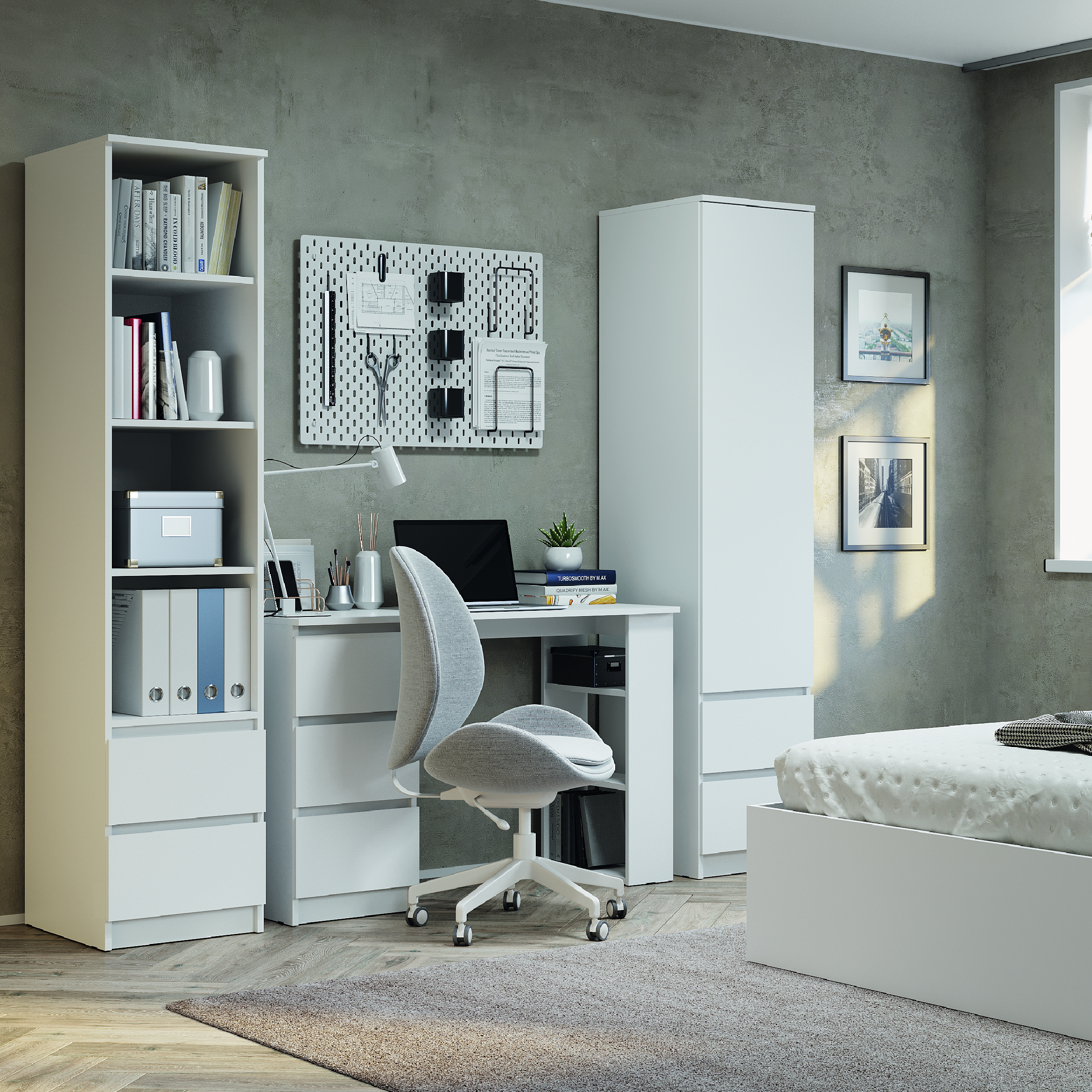 Открытый пенал «Симпл» ПН-18 — это идеальное решение для компактного хранения в любом помещении. Узкий корпус шириной всего 402 мм позволяет разместить модель даже в самом ограниченном пространстве, а высота 1900 мм обеспечивает максимальную вместительность. Пенал надежно крепится к стене, экономя площадь пола. Внутри — два выдвижных ящика на шариковых направляющих и удобные открытые полки. Модель универсальна: подойдет для кухонной утвари, домашней аптечки, книг, документов и важных мелочей. Чистый белый цвет и интегрированные срезы вместо ручек подчеркивают минимализм коллекции.