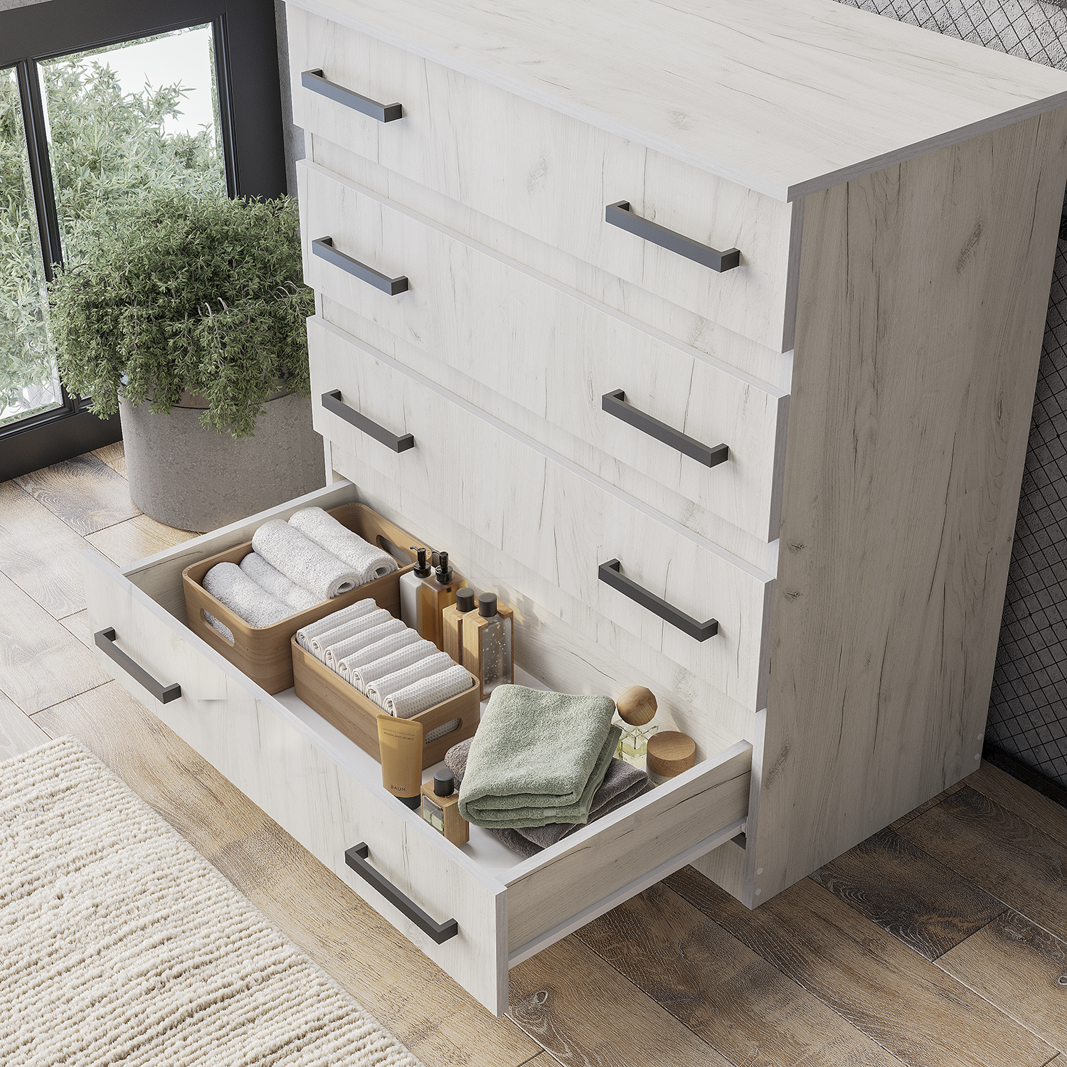 · 6 просторных выдвижных ящиков на роликовых направляющих (длина 400 мм). Оптимально для хранения постельного белья, полотенец, одежды и документов. Нагрузка на ящик — до 5 кг.