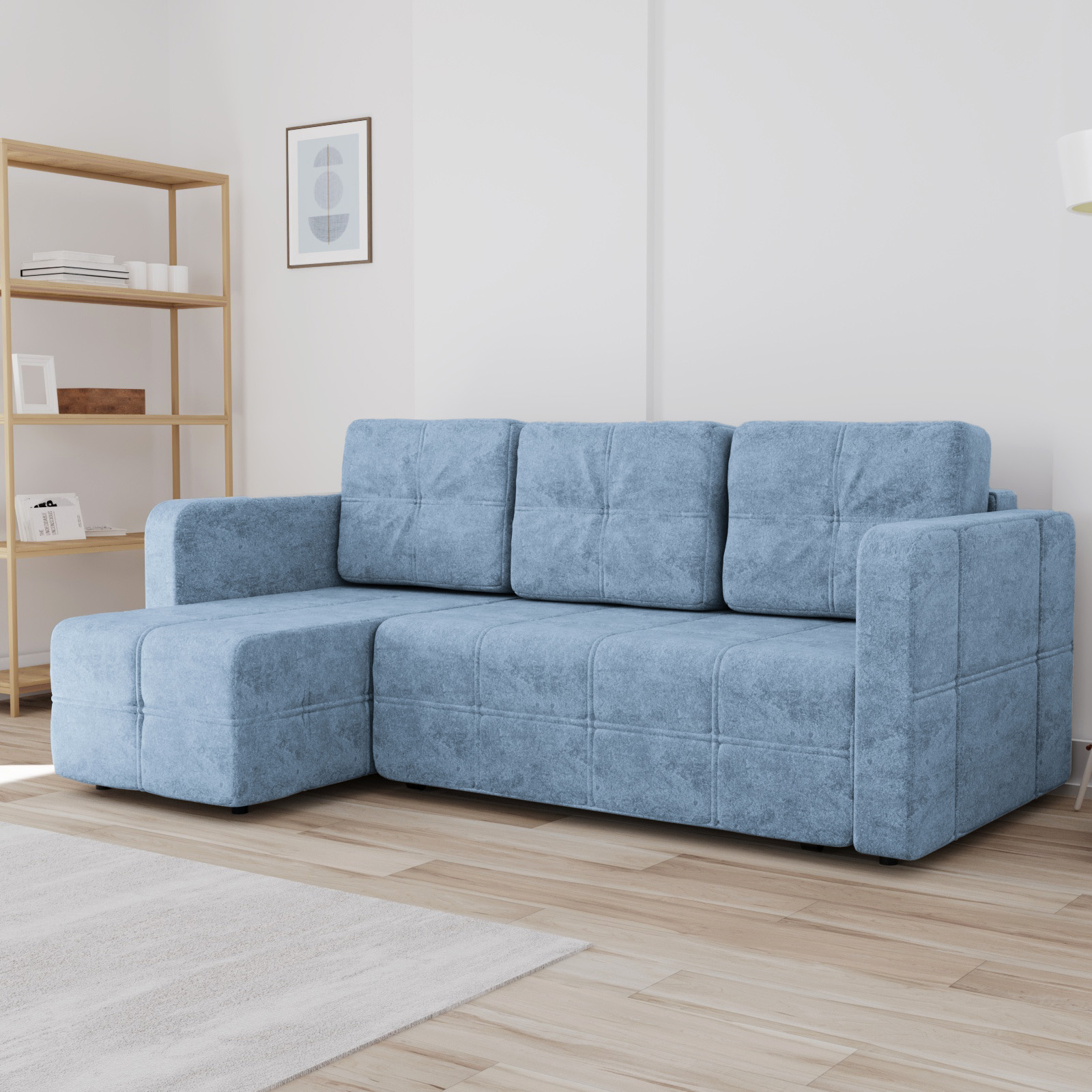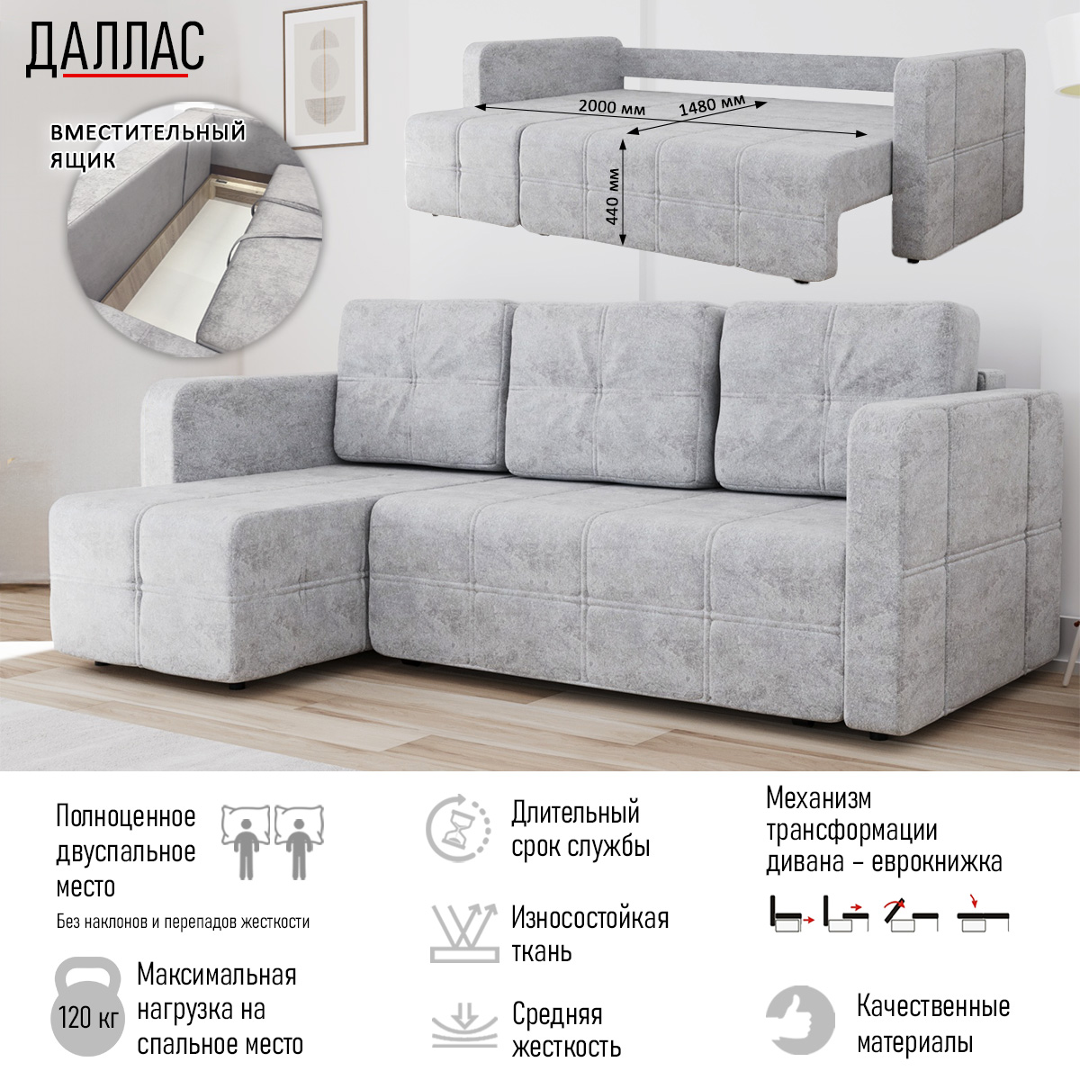 Угловой диван «Даллас» — это идеальное сочетание стильного дизайна, надежности и многофункциональности для вашей гостиной. Благодаря механизму трансформации «еврокнижка» он легко превращается в полноценное двуспальное место.