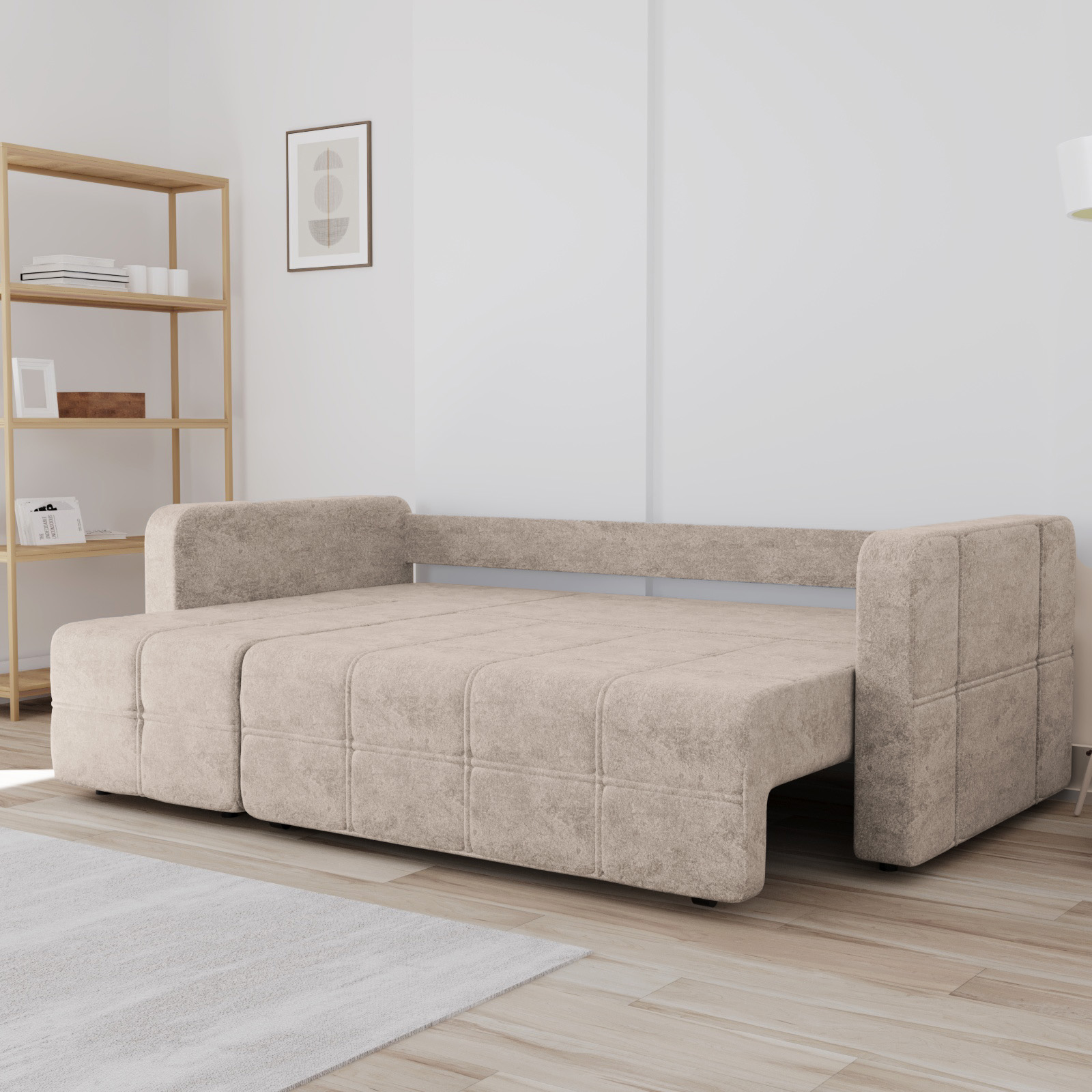 Диван обладает средней жесткостью, что оптимально для комфортного и здорового сна, поддерживая позвоночник. Обивка выполнена из износостойкой ткани, устойчивой к повседневным нагрузкам, что гарантирует дивану опрятный вид на годы.