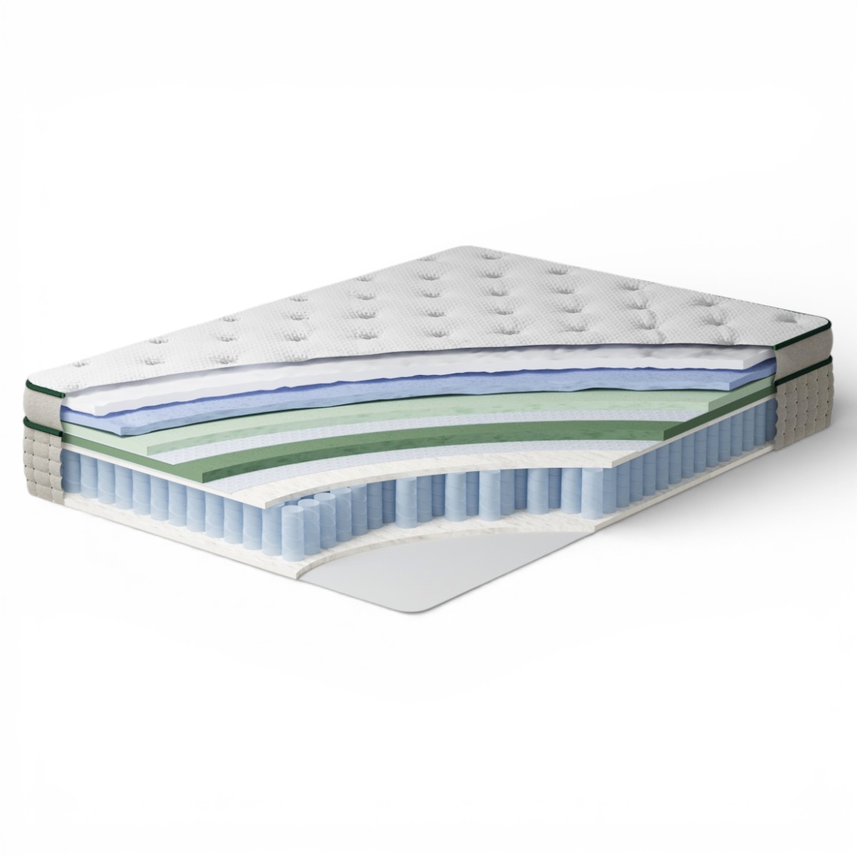 • Натуральный хлопковый наполнитель: Окружает пружинный блок, выполняя роль естественного амортизатора и усиливая воздухопроницаемость.