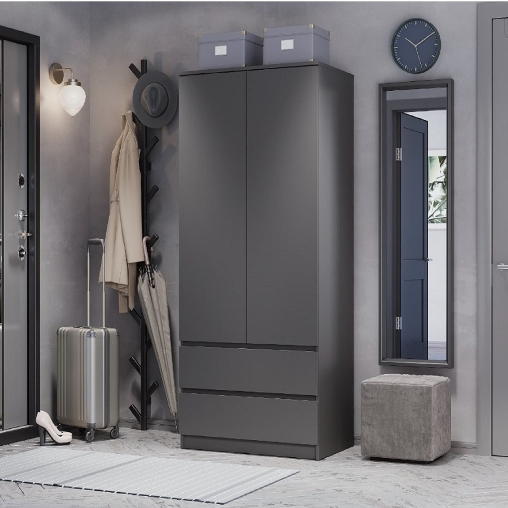 •  Продуманное хранение: внутри расположена штанга для верхней одежды и два вместительных ящика на плавных шариковых направляющих.